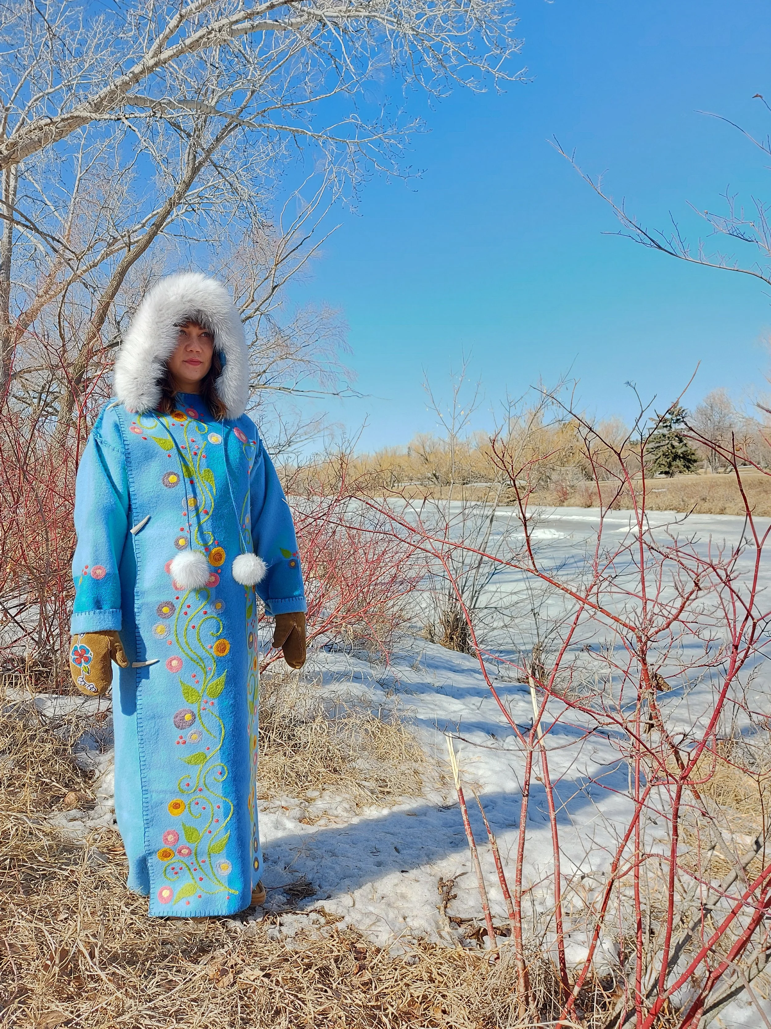 River Woman is a hand-stitched, needle felted capote which was created as a project organized by Metis Nation Alberta (MNA) region 3, Parks Canada and Hudson Bay Canada (HBC). In the winter of 2021 fifteen artists/designers were selected to participate in a Metis Fashion Show – the instructions were to make ‘outerwear’ with the blankets that were given to us. Each designer was given a different blanket to work with. I was given a 350th HBC edition blue blanket. During the course of several weeks we met with the designers, cultural & knowledge keepers and folks from MNA to receive advice, teachings and share our stories. Our last meeting was a virtual celebration where each designer presented their outerwear inspired by the tradition of making capotes. I was honoured to receive the news that my capote, River Woman – which was dedicated to the Metis Woman, mother, daughter, sister and inspired by Katherena Vermette’s poem River Woman made the top five! My capote is now in the collection of Metis Nation Alberta.